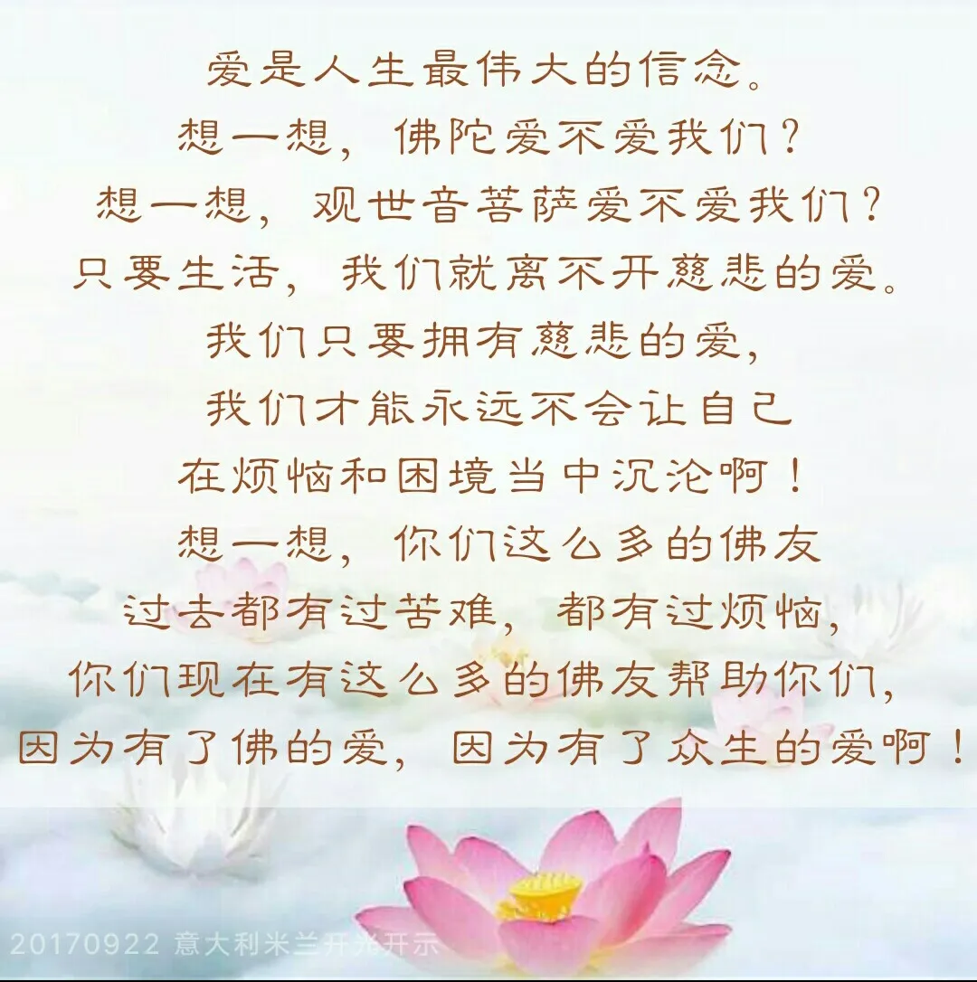 这个故事就是告诉我们,爱是人生最伟大的信念。想一想,佛陀爱不爱我们?想一想,观世音菩萨爱不爱我们?只要生活,我们就离不开慈悲的爱。我们只要拥有慈悲的爱,我们才能永远不会让自己在烦恼和困境当中沉沦啊!想一想,你们这么多的佛友过去都有过苦难,都有过烦恼,你们现在有这么多的佛友帮助你们,因为有了佛的爱,因为有了众生的爱啊!