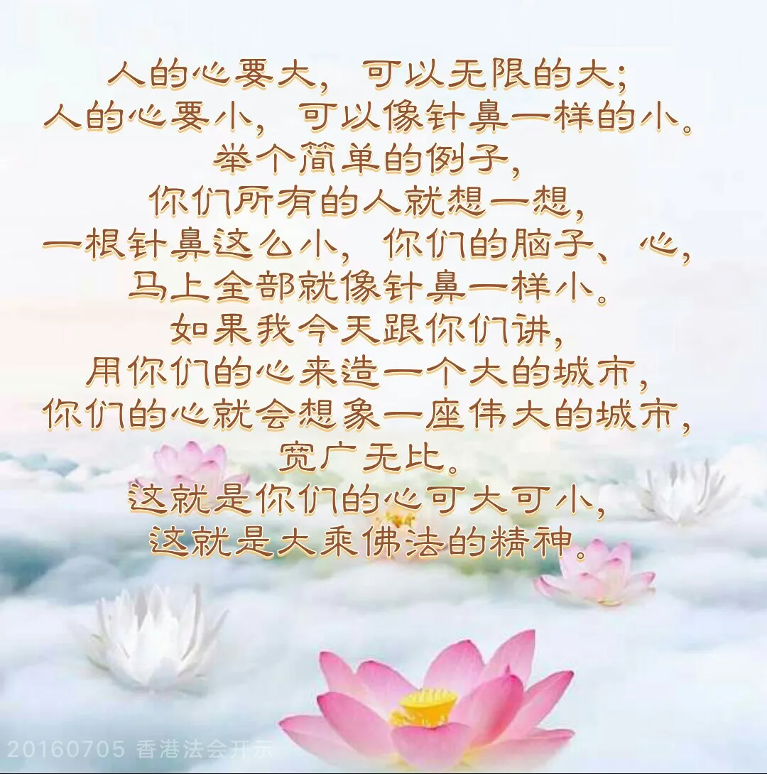 师父曾经跟你们讲过:人的心要大,可以无限的大;人的心要小,可以像针鼻一样的小。举个简单的例子,你们所有的人就想一想,一根针鼻这么小,你们的脑子、心,马上全部就像针鼻一样小。如果我今天跟你们讲,用你们的心来造一个大的城市,你们的心就会想象一座伟大的城市,宽广无比。这就是你们的心可大可小,这就是大乘佛法的精神。