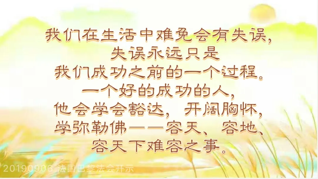 我们在生活中难免会有失误,失误永远只是我们成功之前的一个过程。一个好的成功的人,他会学会豁达,开阔胸怀,学弥勒佛——容天、容地、容天下难容之事。我们每天的日子大多数都是在失落中进行的,我们有失落的心情和忧愁,看不到明天的希望。我们要看到菩萨对我们的关心和关怀,每一天要学佛修心,学会帮助别人,我们就会在痛苦中走向成熟,这就是我们的人生。