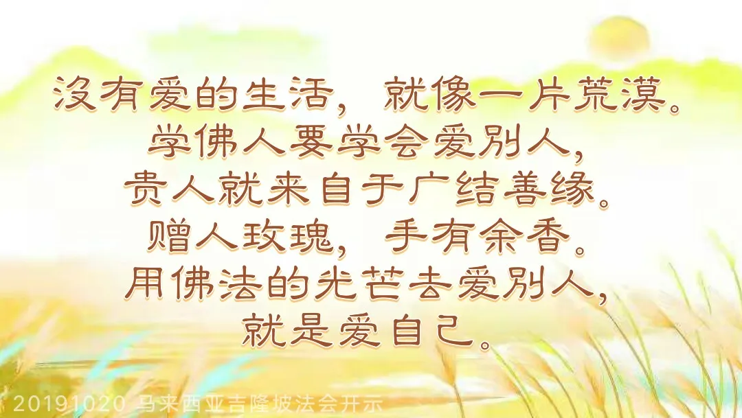 没有爱的生活,就像一片荒漠。学佛人要学会爱别人,贵人就来自于广结善缘。赠人玫瑰,手有余香。用佛法的光芒去爱别人,就是爱自己。常怀宽容感激之心,你就会拥有智慧,因为宽容是一个美德,它会生长智慧。多理解尊重别人才能海纳百川。感谢你的佛友,是他们给了你帮助;感谢你的对手,是他们让你变得更加坚强。