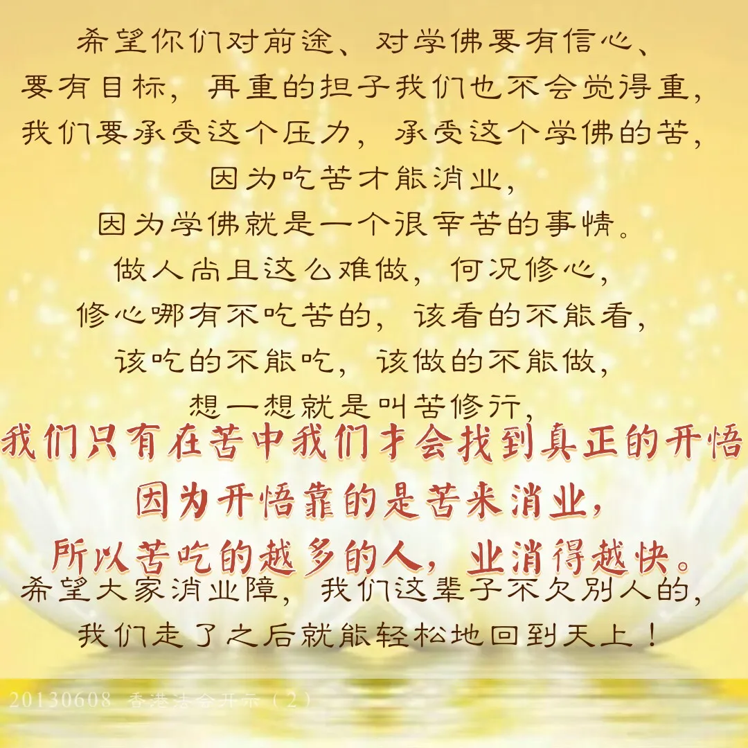 希望你们对前途、对学佛要有信心、要有目标,再重的担子我们也不会觉得重,我们要承受这个压力,承受这个学佛的苦,因为吃苦才能消业,因为学佛就是一个很辛苦的事情。做人尚且这么难做,何况修心,修心哪有不吃苦的,该看的不能看,该吃的不能吃,该做的不能做,想一想就是叫苦修行,我们只有在苦中我们才会找到真正的开悟,因为开悟靠的是苦来消业,所以苦吃的越多的人,业消得越快。希望大家消业障,我们这辈子不欠别人的,我们走了之后就能轻松地回到天上!