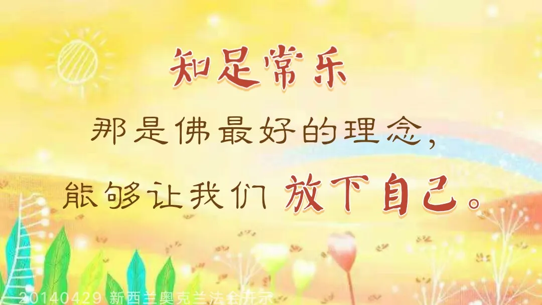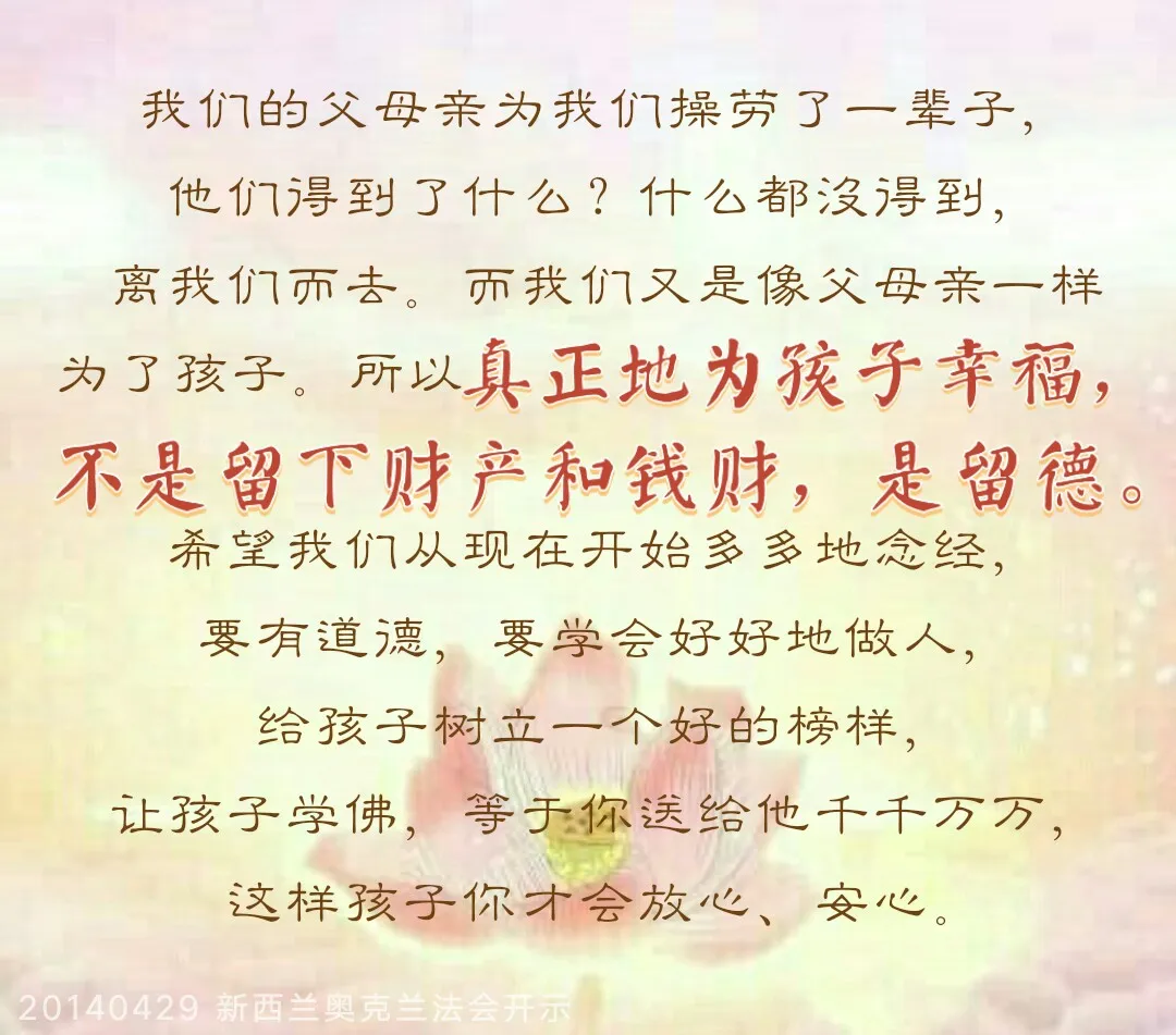 我们今天还要为这个、为那个,天天在烦恼, 我们天天还在想着自己要穿什么鞋子,想一想,全世界有几百万的人没有脚,我们今天有了unit[单元],我们还要 house[住宅],有了 house,我们还要搬到海边;我们今天有了这个车还要那个车,我们哪一天会满足?所以知足常乐,那是佛最好的理念,能够让我们放下自己。我们的父母亲为我们操劳了一辈子,他们得到了什么?什么都没得到,离我们而去。而我们又是像父母亲一样为了孩子。所以真正地为孩子幸福,不是留下财产和钱财,是留德。希望我们从现在开始多多地念经,要有道德,要学会好好地做人,给孩子树立一个好的榜样,让孩子学佛,等于你送给他千千万万,这样孩子你才会放心、安心。