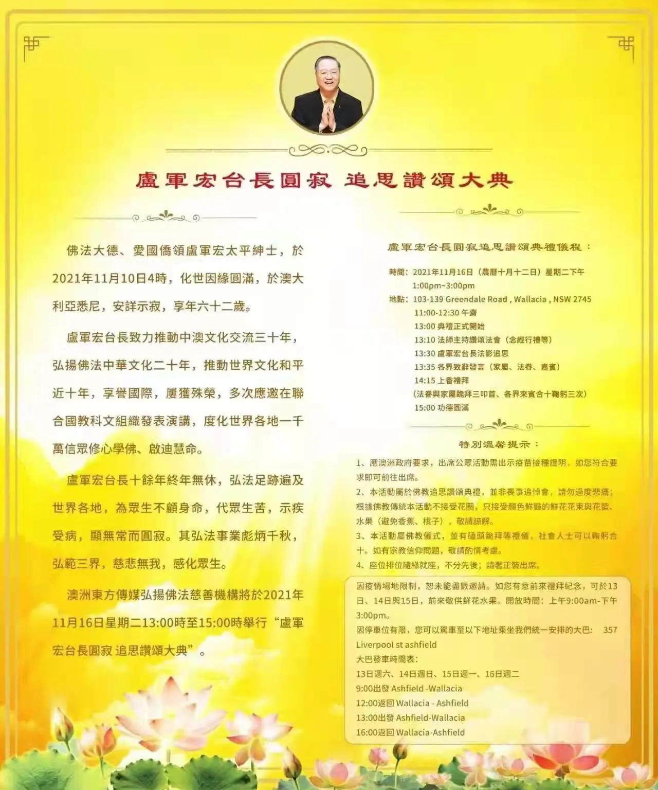 心-灵-法-门开山宗师、爱国侨领卢-军-宏-台-长,于2021年11月10日4时,化世因缘圆满,于澳大利亚悉尼,安详示寂,享年六十二岁。