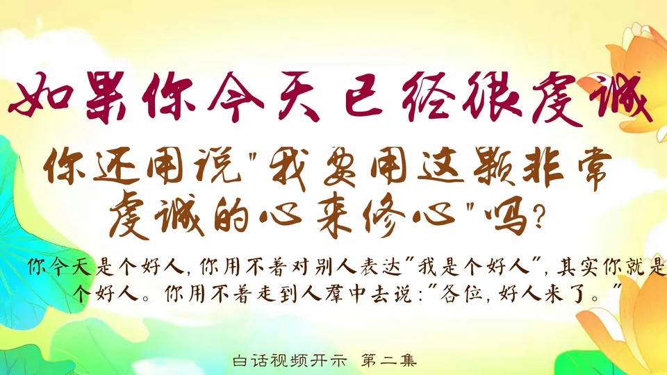 如果你今天已经很虔诚,你还用说“我要用这颗非常虔诚的心来修心”吗?你今天是个好人,你用不着对别人表达“我是个好人”,其实你就是个好人。你用不着走到人群中去说:“各位,好人来了。”