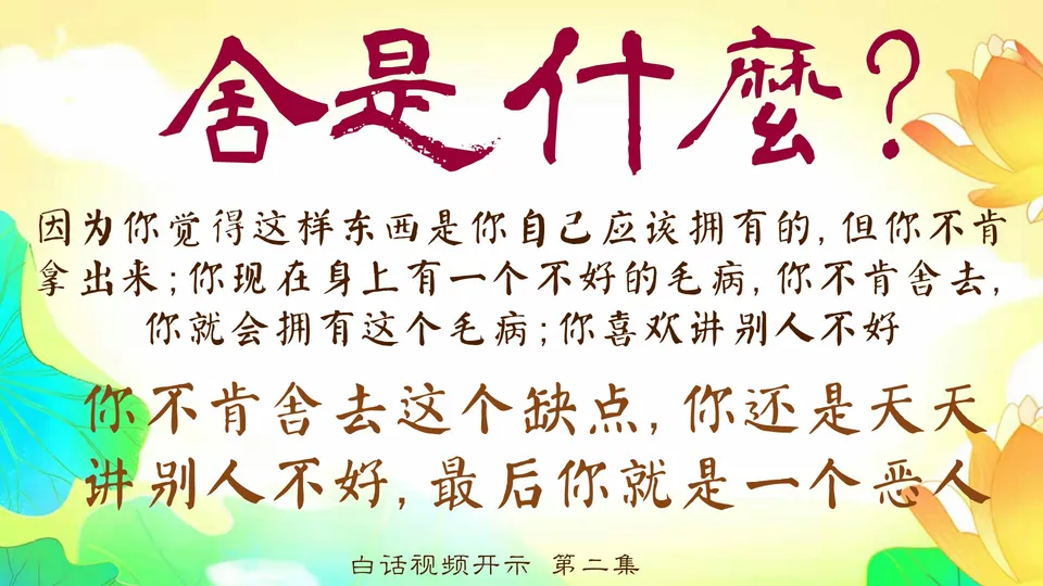 舍是什么?因为你觉得这样东 西是你自己应该拥有的,但你不肯拿出来;你现在身上有一个不好的毛病, 你不肯舍去,你就会拥有这个毛病;你喜欢讲别人不好,你不肯舍去这个缺点,你还是天天讲别人不好,最后你就是一个恶人。