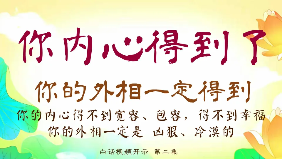 你内心得到了,你的外相一定得到;你的内心得不到宽容、包容,得不到幸福,你的外相一定是凶狠、冷漠的。