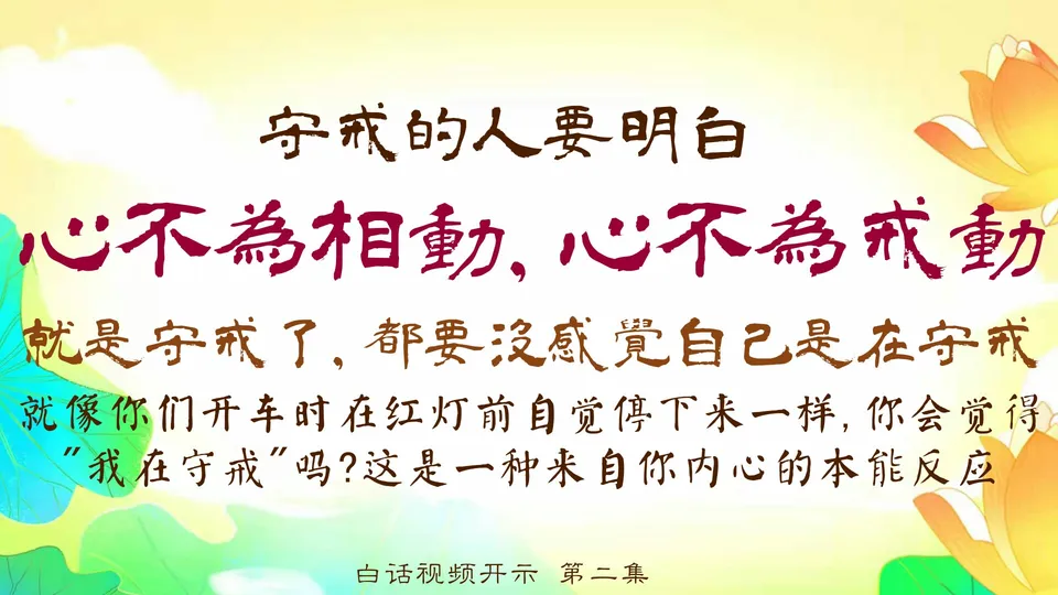 守戒的人要明白,心不为相动,心不为戒动,就是守戒了,都 要没感觉自己是在守戒。就像你们开车时在红灯前自觉停下来一样,你会 觉得 “我在守戒”吗?这是一种来自你内心的本能反应。