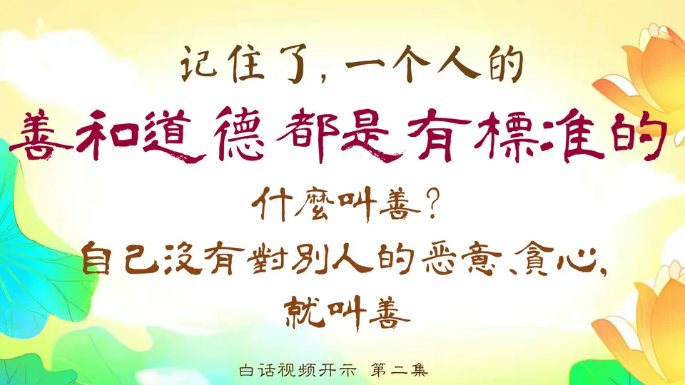 记住了,一个人的善和道德都是有标准的。什么叫善?自己没有对别人的恶意、贪心,就叫善。