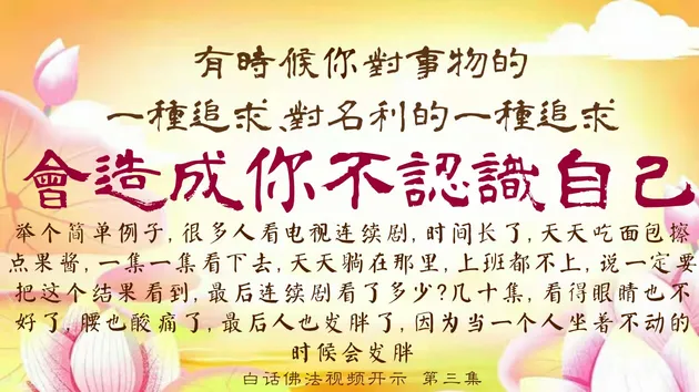有时候你对事物的一种追求、对名利的一种追求,会造成你不认识自己。举个简单例子,很多人看电视连续剧,时间长了,天天吃面包擦点果酱,一集一集看下去,天天躺在那里,上班都不上,说一定要把这个结果看到,最后连续剧看了多少?几十集,看得眼睛也不好了,腰也酸痛了,最后人也发胖了,因为当一个人坐着不动的时候会发胖。