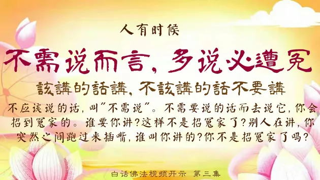 人有时候“不需说而言,多说必遭冤”,该讲的话讲,不该讲的话不要讲。不应该说的话,叫“不需说”。不需要说的话而去说它,你会招到冤家的。谁要你讲?这样不是招冤家了?别人在讲,你突然之间跑过来插嘴,谁叫你讲的?你不是招冤家了吗?