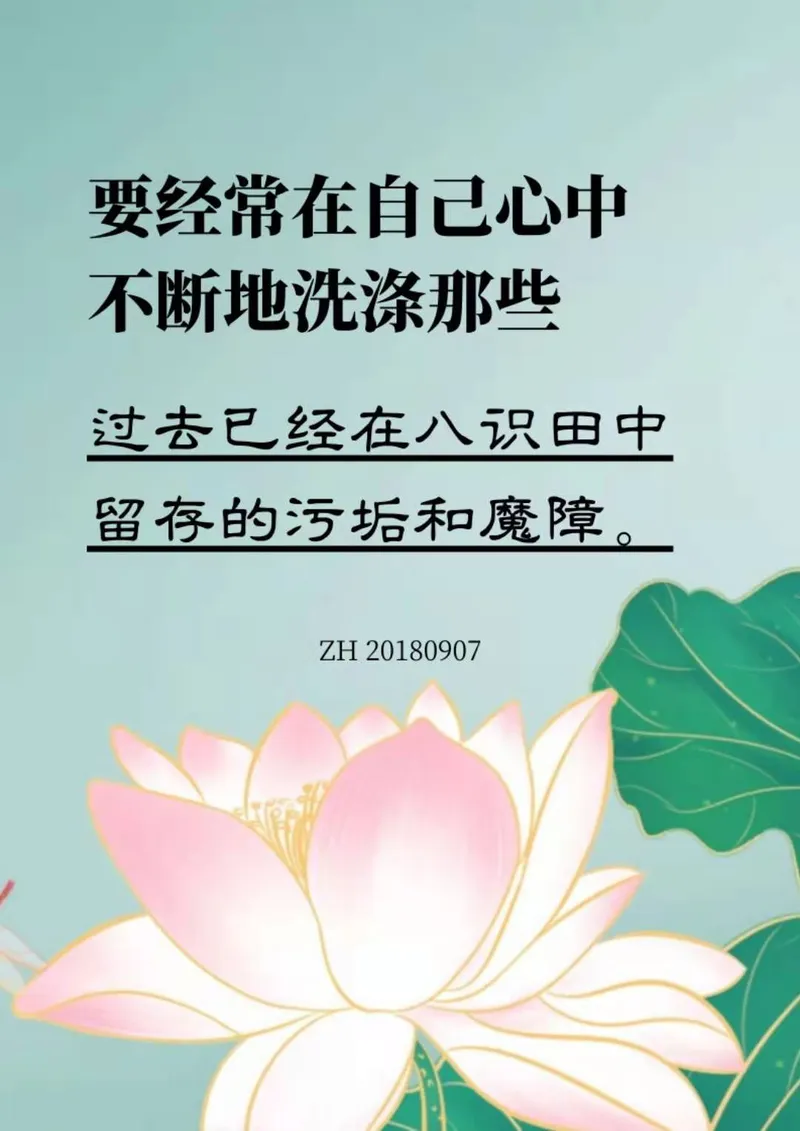 要经常在自己心中不断地洗涤那些过去已经在八识田中留存的污垢和魔障。每天洗,每天干净,就像人洗脸一样,就像刷牙一样,每天洗,每天干净。