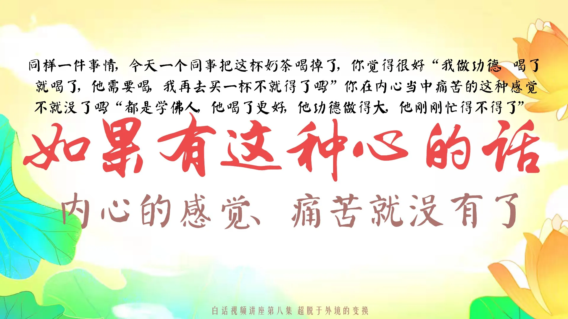 同样一件事情,今天一个同事把这杯奶茶喝掉了,你觉得很好,“我做功德,喝了就喝了,他需要喝,我再去买一杯不就得了吗?”你在内心当中痛苦的这种感觉不就没了吗?“都是学佛人,他喝了更好,他功德做得大,他刚刚忙得不得了”,如果有这种心的话,内心的感觉、痛苦就没有了。