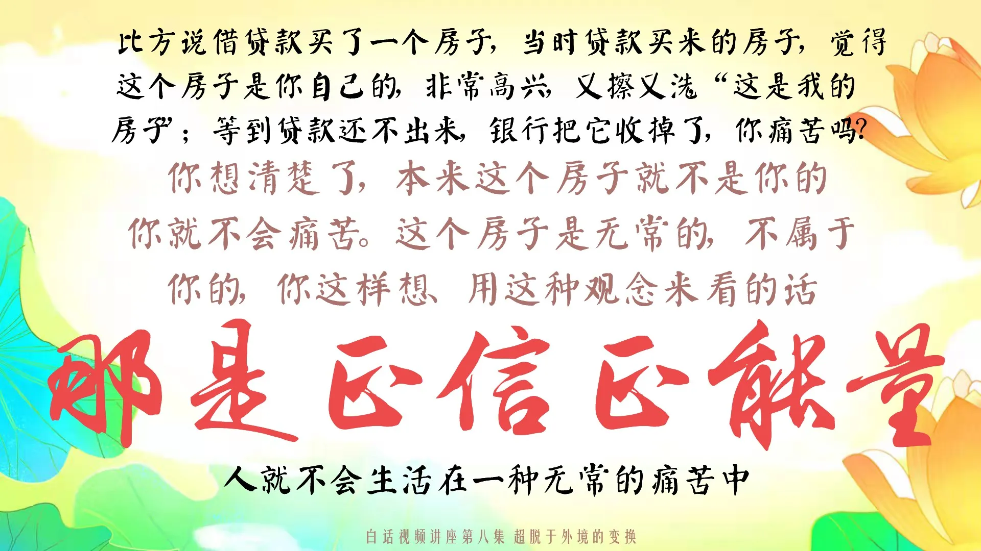 比方说借贷款买了一个房子,当时贷款买来的房子,觉得这个房子是你自己的,非常高兴,又擦又洗,“这是我的房子”;等到贷款还不出来,银行把它收掉了,你痛苦吗?你想清楚了,本来这个房子就不是你的,你就不会痛苦。这个房子是无常的,不属于你的,你这样想、用这种观念来看的话,那是正信正能量,人就不会生活在一种无常的痛苦中。