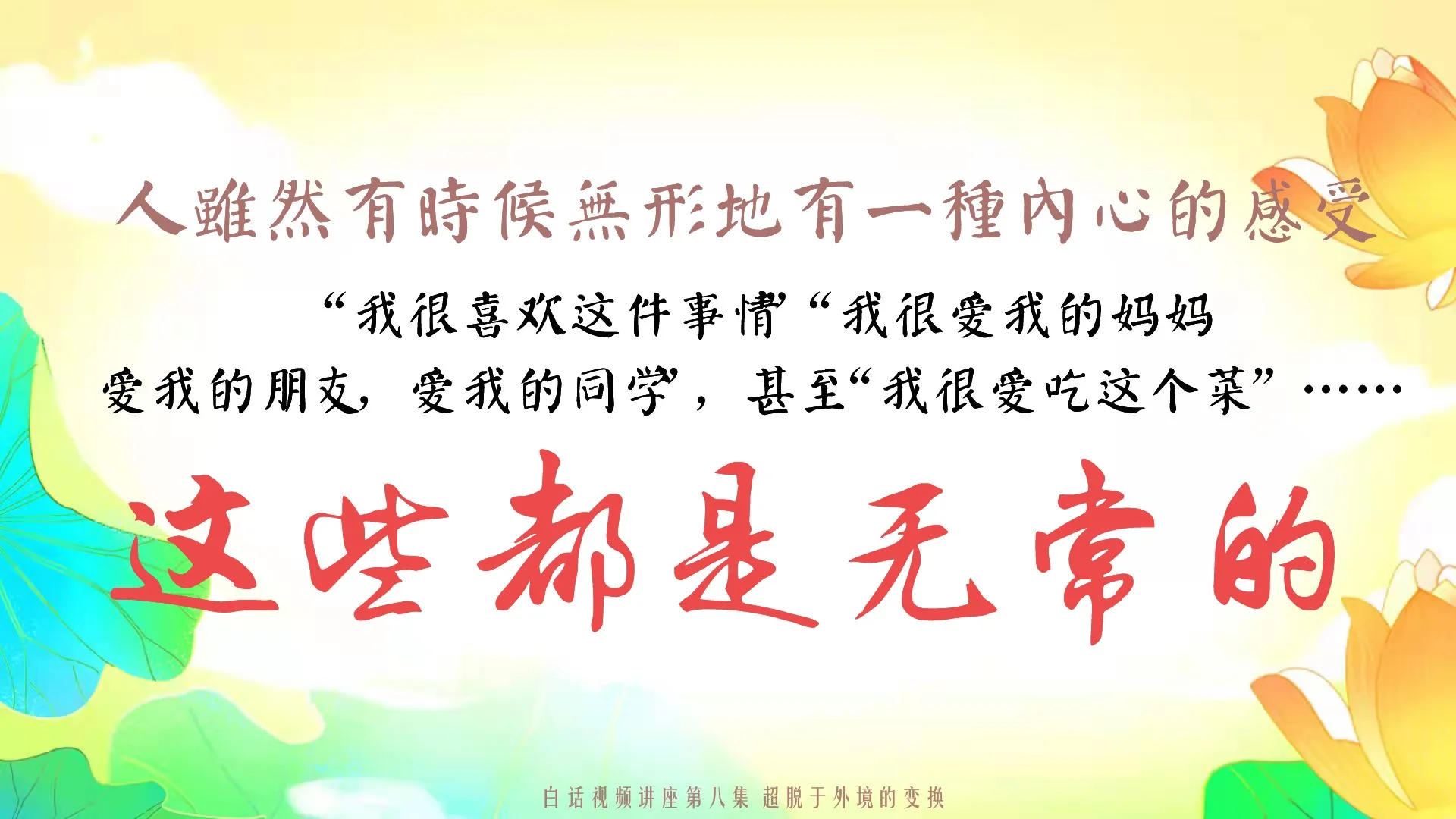 人虽然有时候无形地有一种内心的感受,“我很喜欢这件事情”“我很爱我的妈妈,爱我的朋友,爱我的同学”,甚至“我很爱吃这个菜”……这些都是无常的。