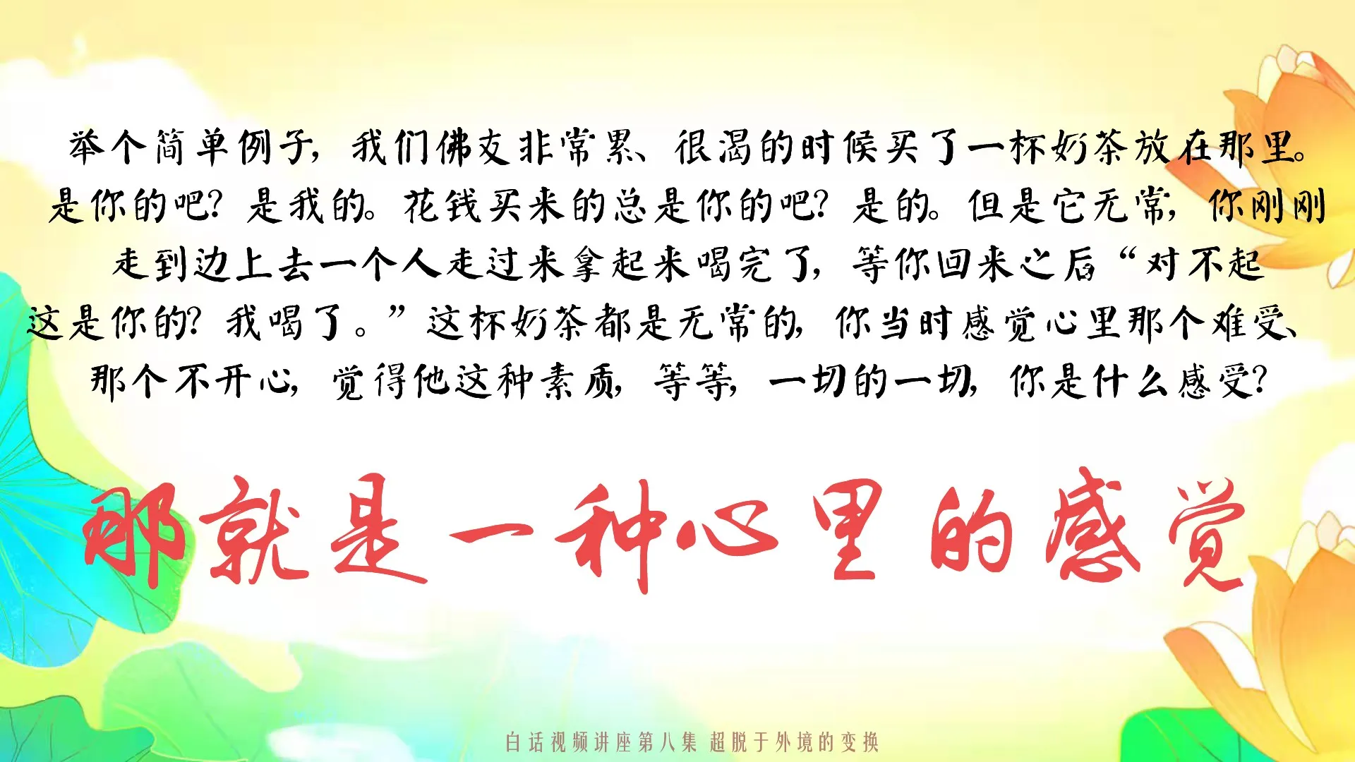 举个简单例子,我们佛友非常累、很渴的时候买了一杯奶茶放在那里。是你的吧?是我的。花钱买来的,总是你的吧?是的。但是它无常,你刚刚走到边上去,一个人走过来拿起来喝完了,等你回来之后:“对不起,这是你的?我喝了。”这杯奶茶都是无常的,你当时感觉心里那个难受、那个不开心,觉得他这种素质,等等,一切的一切,你是什么感受?那就是一种心里的感觉。