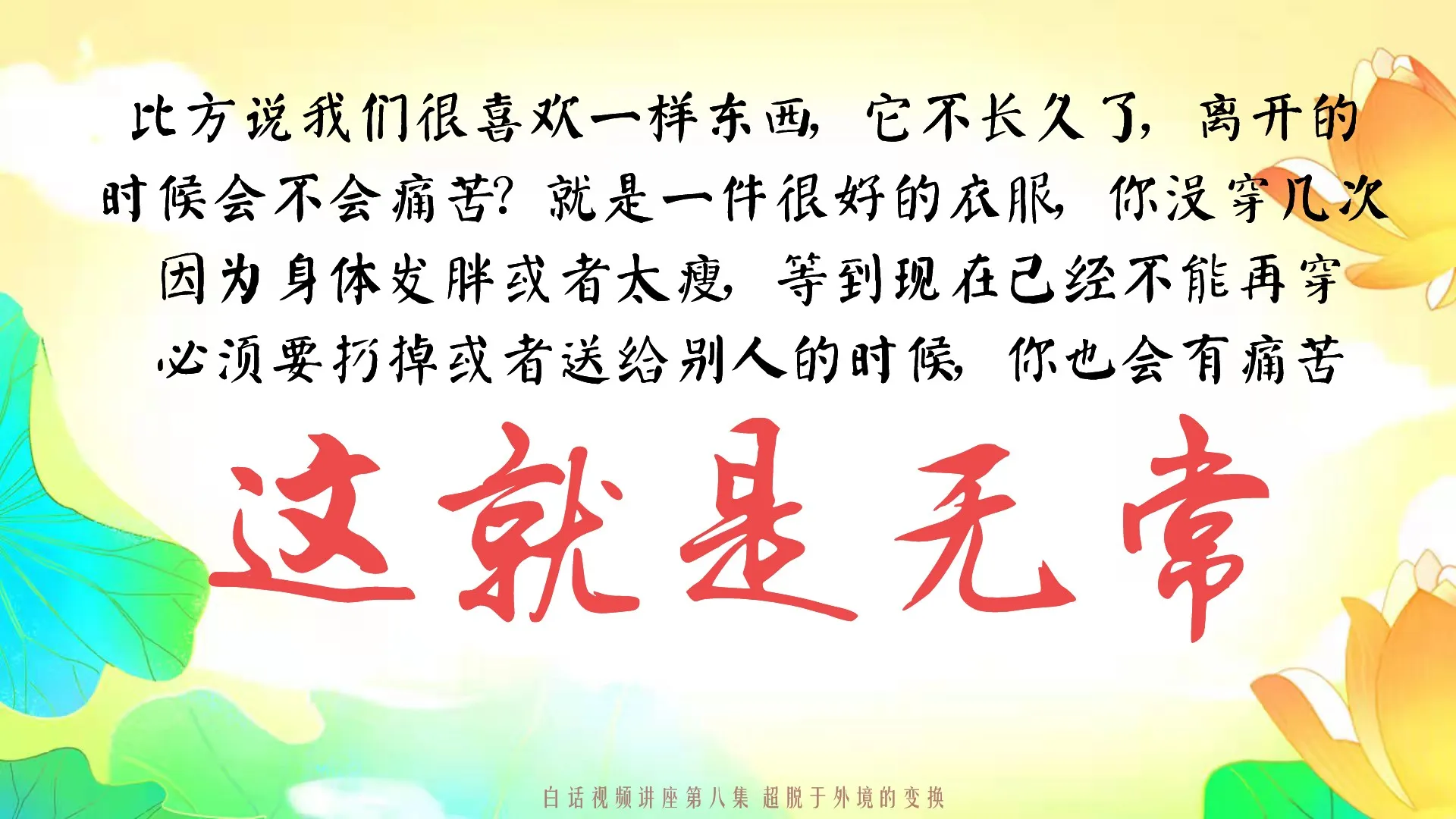 大家想一想是不是这样。比方说我们很喜欢一样东西,它不长久了,离开的时候会不会痛苦?就是一件很好的衣服,你没穿几次,因为身体发胖或者太瘦,等到现在已经不能再穿,必须要扔掉或者送给别人的时候,你也会有痛苦,这就是无常。