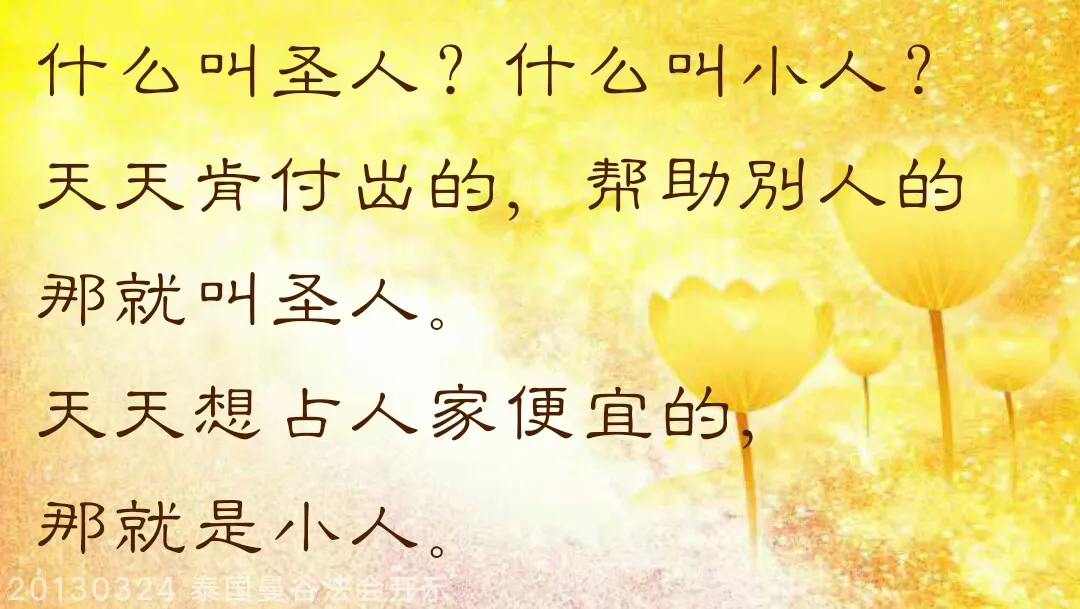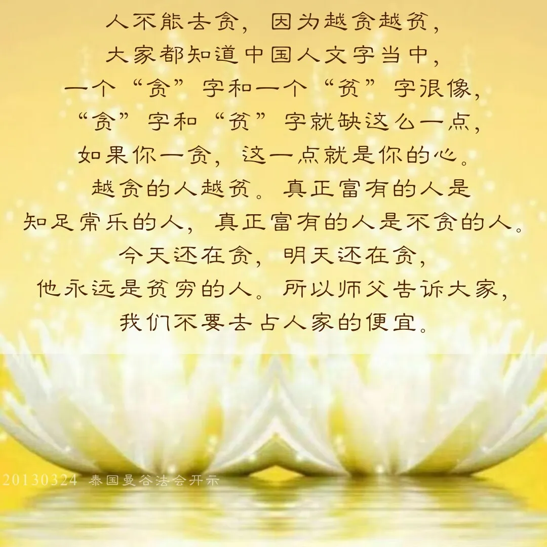 这个故事说明人不能去贪,因为越贪越贫,大家都知道中国人文字当中,一个“贪”字和一个“贫”字很像,“贪”字和“贫”字就缺这么一点,如果你一贪,这一点就是你的心。越贪的人越贫。真正富有的人是知足常乐的人,真正富有的人是不贪的人。今天还在贪,明天还在贪,他永远是贫穷的人。所以师父告诉大家,我们不要去占人家的便宜。什么叫圣人?什么叫小人?天天肯付出的,帮助别人的那就叫圣人。天天想占人家便宜的,那就是小人。